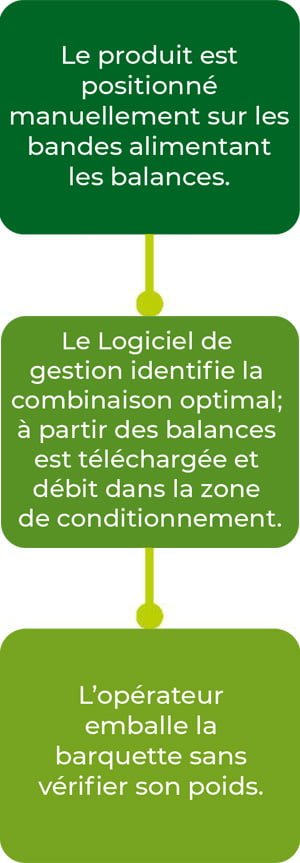 Bulltec a étudié et développé un nouveau type d’installation, pour faciliter et optimiser le traitement des produits destinés au conditionnement en barquettes/paniers/filets à poids garanti. Ce type de ligne fait l’objet d’un brevet déposé par Bulltec en 2022. L’installation est constituée d’une série des convoyeurs qui alimentent le produit sur une batterie de bandes de poids, qui établissent, grâce à l’application du logiciel Bulltec, une combinaison optimale d’un certain nombre de pièces. Le poids minimum est ainsi garanti pour chaque colis, limitant les dépassements.