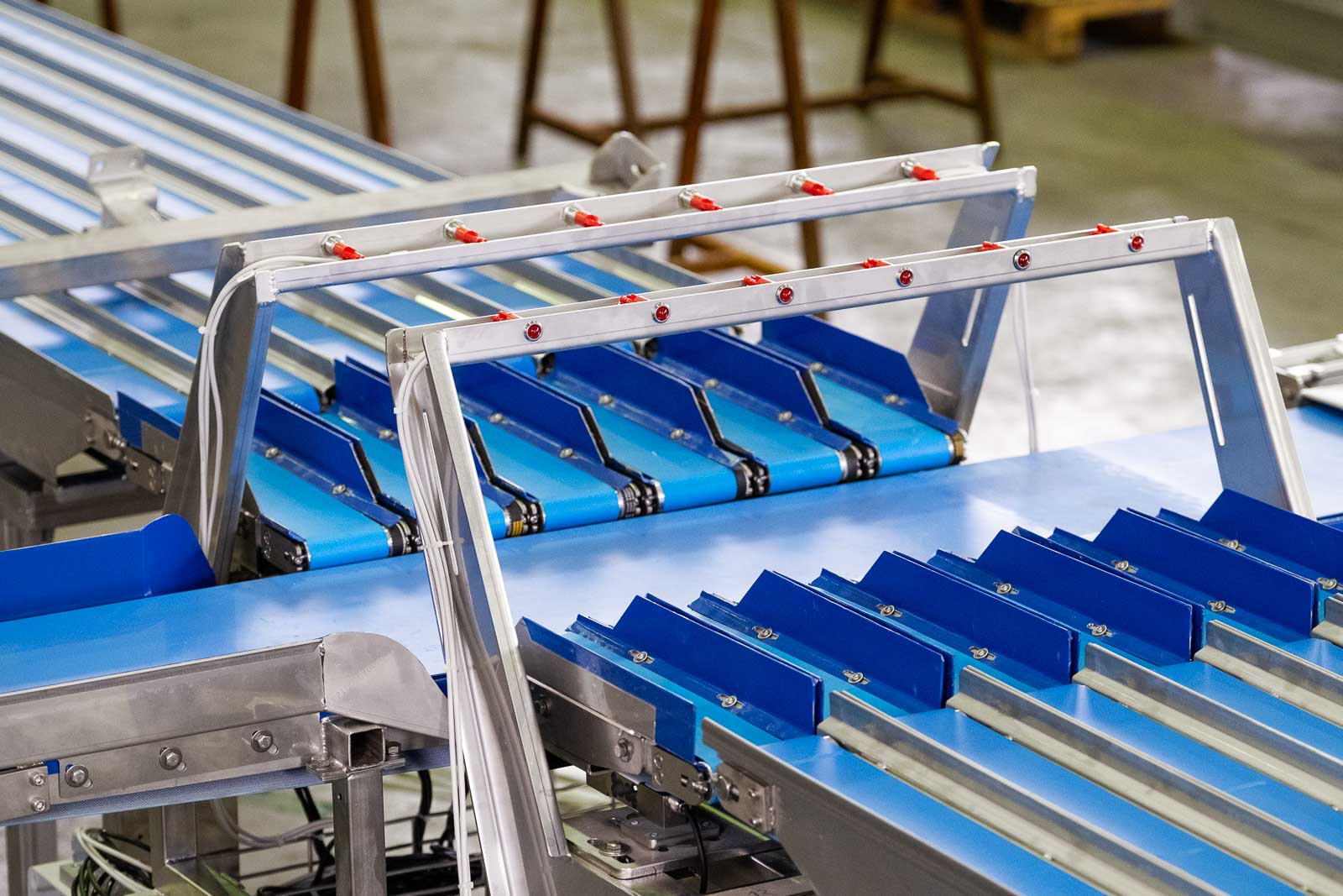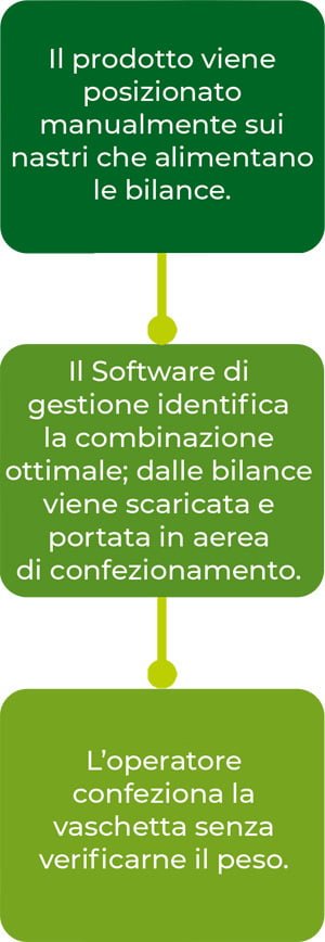 Bulltec ha studiato e sviluppato una nuova tipologia di impianto, per agevolare e ottimizzare la lavorazione dei prodotti destinati al confezionamento in vaschette/cestini/rete a peso garantito. Questa tipologia di linea è oggetto di brevetto depositato da Bulltec nel 2022. L’impianto si compone di una serie di nastri trasportatori che alimentano il prodotto su una batteria di nastri peso, i quali vanno a stabilire, attraverso l’applicazione di un software Bulltec, una combinazione ottimale di un numero di pezzi. Viene così garantito il peso minimo, per ogni confezione, limitando gli eccessi.